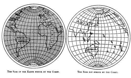 If the reader will examine the map on page 93, he will see that the distribution of the Drift accords with this theory. If we suppose the side of the earth shown in the left-hand figure was presented to the comet, we will see why the Drift is supposed to be confined to Europe, Africa, and parts of America; while the right-hand figure will show the half of the world that escaped.