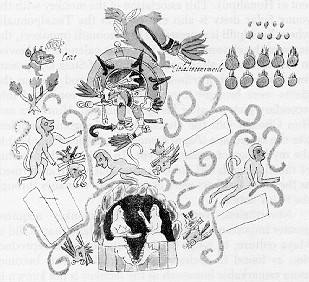 Hun Bátz and Hun Chouén are converted into patrons of dance, music, smiles, merriment, pleasure, and lasciviousness inasmuch as they danced naked to the music played by the twins, provoking the irresistible laugh of their grandmother who saw their strange penes. The memory of this episode survives in the song of Hunahpú-coy which the Quiché Indians continue to play. But it is in the picture on page 13 of the Borgia Codex that we have the most vivid illustration of the "monkey of Hunahpú." There we see a simian dancing before Xochipilli, who is seated on a throne (in Mexican mythology Xochipilli is the equivalent of Hunahpú).