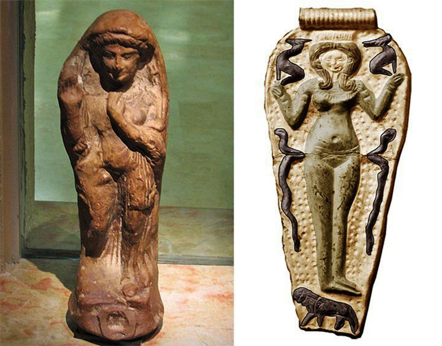 también asociada a Asherah. A la derecha: medalla colgante de Ugarit, con la figura y símbolos de la Diosa. Crédito de imagen: Hanay / Ugaritic work Wikimedia commons.