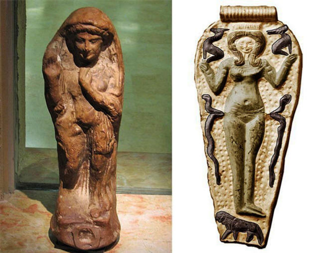 Izquierda: estatuilla de la Diosa Tanit, también asociada a Asherah. Derecha: medalla colgante de Ugarit, con la figura y símbolos de la Diosa. Crédito de imagen: Hanay / Ugaritic work / Wikimedia commons.