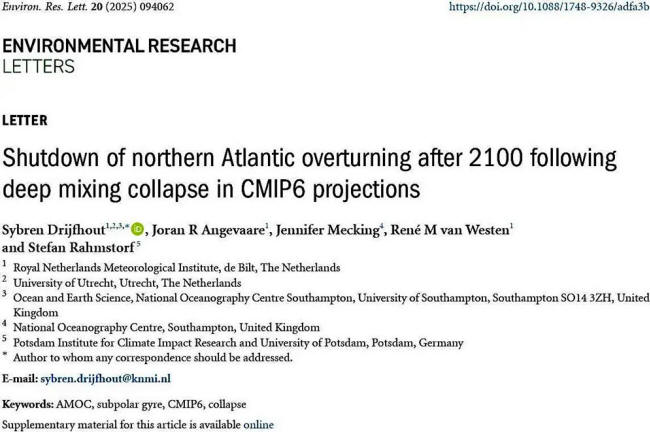 A brand-new paper in Environmental Research Letters (ERL), titled "Shutdown of Northern Atlantic Overturning after 2100 following deep Mixing Collapse in CMIP6 projections" by Sybren Drijfhout and colleagues claims,