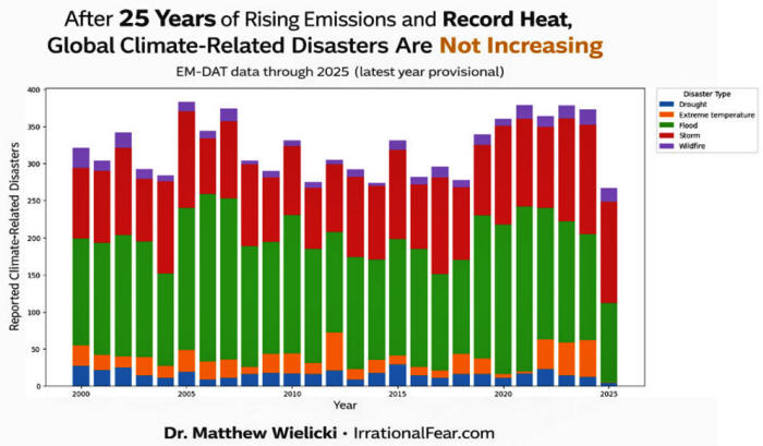 And in 2025, the year following the highest CO2 concentrations and some of the warmest global temperatures on record, total "disaster" counts are lower than at any point in the past quarter-century.
