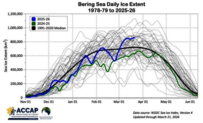Bering Sea daily ice extent from 1978–79 to 2025–26.
