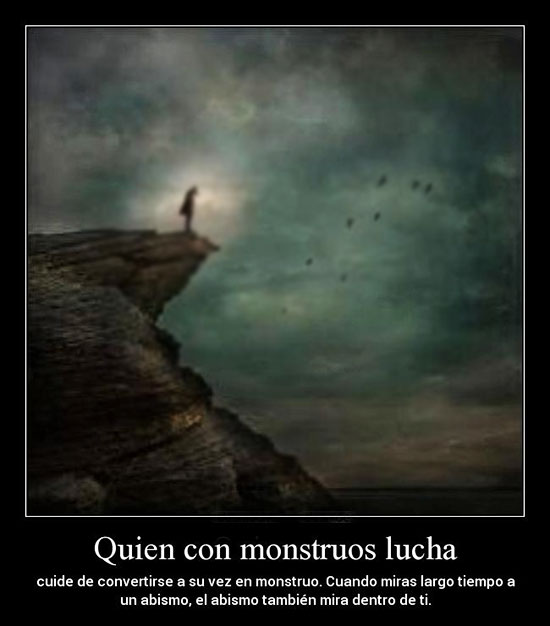 Nietzsche sugiere que quienes se enfrentan a la crueldad, la corrupción o el abuso pueden, de manera gradual, adoptar los mismos rasgos que intentan erradicar.
