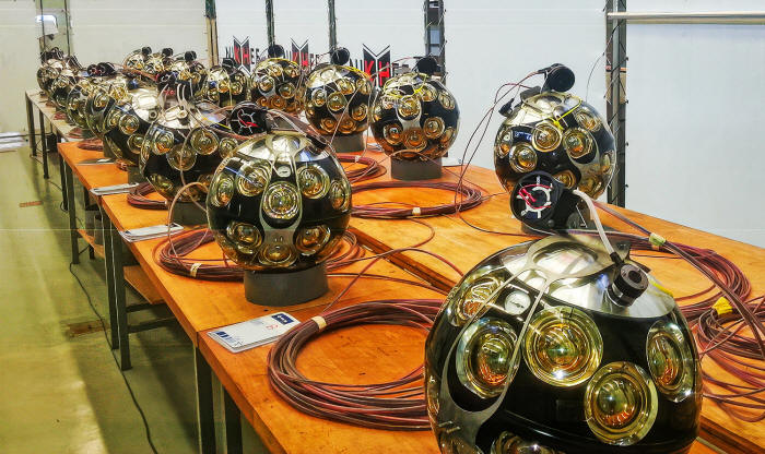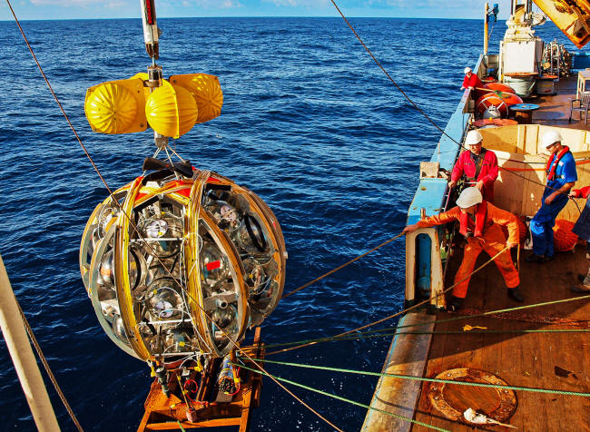 Workers prepare to deploy a string of optical sensors, which will be attached to the seafloor and unspooled