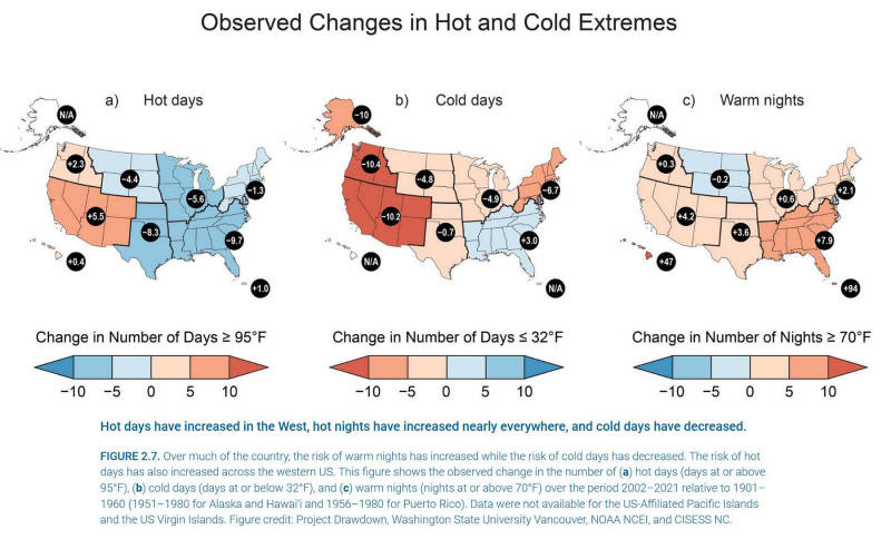 Instead, the number of hot days has decreased across most of the United States, except the West Coast.