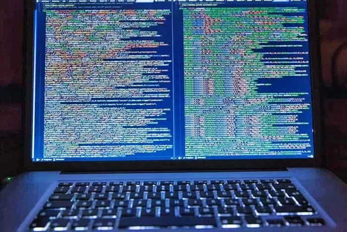 in una stanza poco illuminata e digita del codice su un laptop per sfruttare le vulnerabilità del software.
