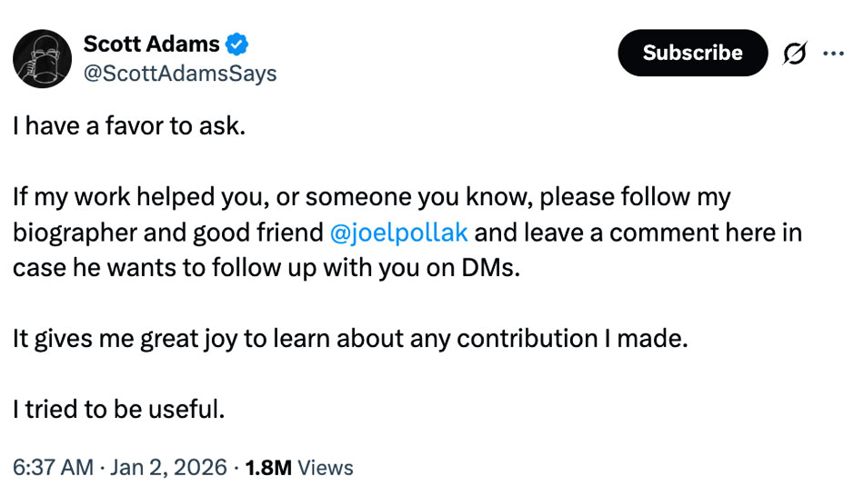 Then, on May 19, 2025, Scott Adams disclosed to his audience that,