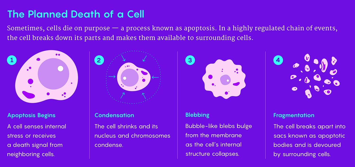 Apoptosis, as this process is known, seems as unlikely as it is violent. And yet some cells undergo this devastating but predictable series of steps to kill themselves on purpose.