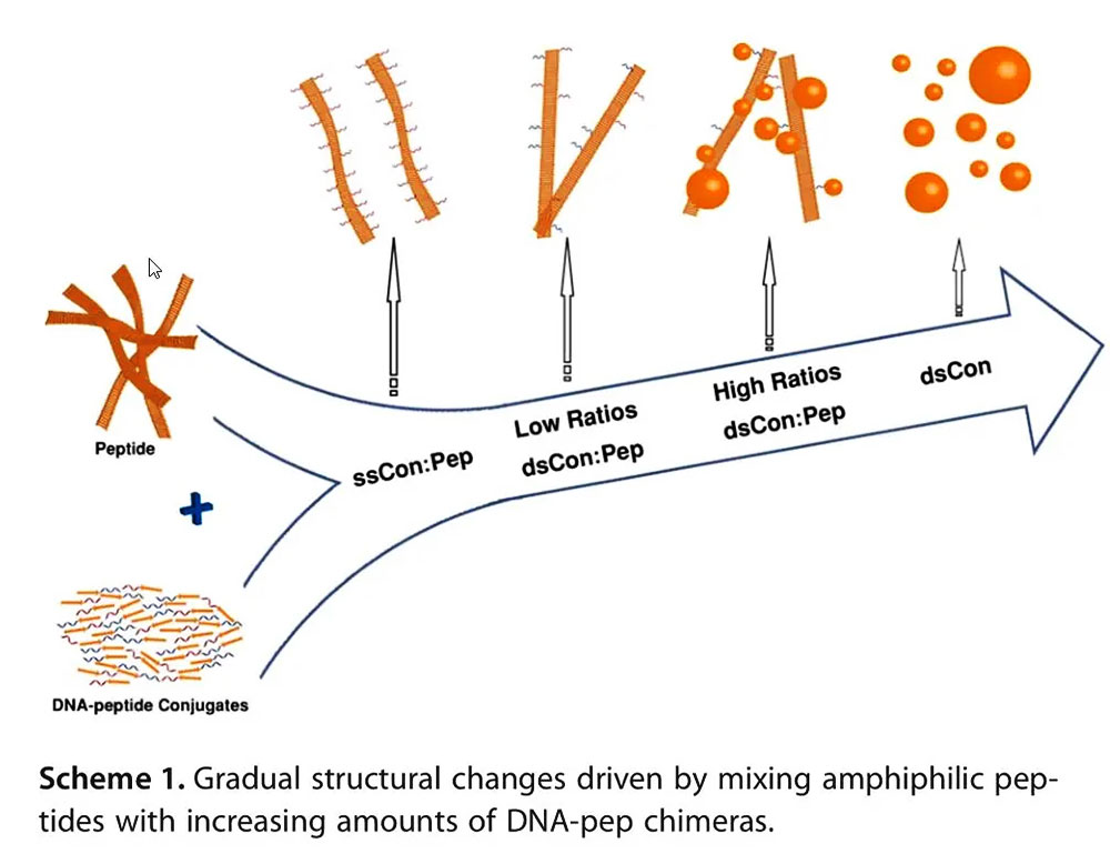 In an aqueous environment, nucleobases - the genetic "letters" of structures like RNA, DNA, or even PNA (peptide nucleic acids) - may line up along the various amino acids in a peptide chain.