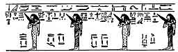 7-10. The four coffers of Osiris, concerning which it is said: "[These are the] hidden magical figures of the Tuat, the funeral shrines of the hidden heads. [When] those who reached this region [come there, the hidden heads] appear, [and when they have heard the voice of RA] they eat their own forms, after this great god hath passed them by." The line of hieroglyphics above the upper register reads: