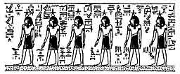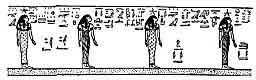 5. Three headless figures, kneeling, with their arms tied behind their backs; these represent the enemies of Osiris. Behind these stands a fierce cat-headed (or, lynx-headed) god, who holds a huge pointed stake in one hand, and flourishes a large knife in the other.