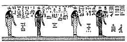1. The god HERU-HER-KHENT-F, seated on a throne, as his name implies. He is hawk-headed, and wears the solar disk encircled by a serpent; in his right hand is the symbol of life, and in his left a sceptre. The other forms of his name are ### and ###. Of this god it is said: "The work of this figure who is in this picture is in the Tuat, and it is for him to send the stars on their way, and to make the hours to go on their way in the Tuat." The stars are personified by gods, twelve in number, who stand each with a star on his head. Their names are:--