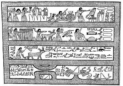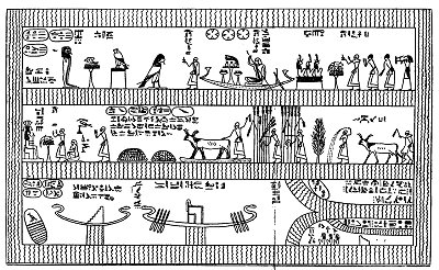 If now we compare this picture with that front the Papyrus of Nebseni we shall find that the actual operations of ploughing, reaping, and treading out of the corn are depicted on the Papyrus, and that several figures of gods and the deceased have been added. The text speaks of offerings made by the deceased, and of his sailing in a boat, &c., therefore the artist