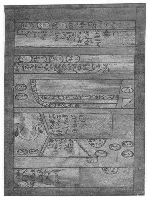 Sekhet-hetepet. (From the Papyrus of Anhai--XXIInd Dynasty.) Sekhet-hetepet. (From the Turin Papyrus-Ptolemaïc Period.)added scenes in which he is depicted doing these things; and the lower part of the picture in the Papyrus has been modified considerably. In the second division it may be noted that Nebseni is seen laying both hands on the back of the Bennu bird; there is no authority for this in the older copy of the picture. In the illustration on p. 55, which is reproduced from the coffin of Sen, in the British Museum (No. 30,841), a still simpler form of Sekhet-hetepet is seen; here we have only nine eyots, which are grouped together, and no inscription of any kind.