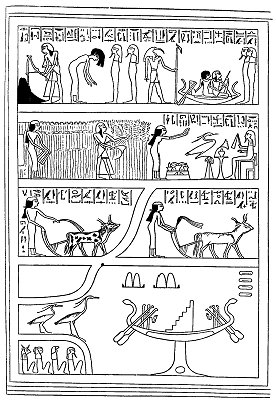 gods in Sekhet-hetep" occupied another section of it. At the end of a short canal was moored a boat, provided with eight oars or paddles, and each end of it terminated in a serpent's head; in it was a flight of steps. The deceased, as we see, also possessed a boat wherein he sailed about at will, but its form is different from that of the boat moored at the end of the canal. The operations of ploughing, and of seed-time and harvest, are all represented. As to the deceased himself, we see him in the act of offering incense to the "great company of the gods," and he addresses a bearded figure, which is intended probably to represent his father, or some near relation; we see him paddling in a boat, and also sitting on a chair of state smelling a flower, with a table of offerings before him. None of the inscriptions mentions Sekhet-Aaru, but it is distinctly said that the reaping of the grain by the deceased is taking place in Sekhet-hetep, or Sekhet-hetepet.