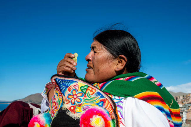 Rosa Copa ofrece un 'kintu' de hojas de coca a la 'qochamama' en quechua, 'qotamama' en aymara: la madre de las aguas que habita en el Titicaca, en el cerro Huaisapata, Puno, en mayo de este año. Illa Liendo Tagle