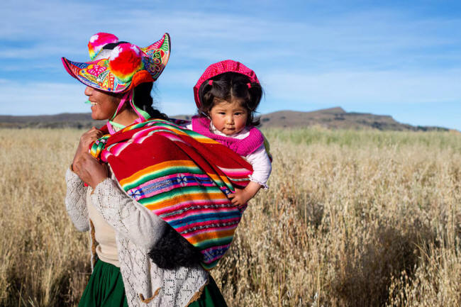 Gloria Supo carga a su hija Aitana en San Juan de Yancaco Grande, Capachica, Puno.
