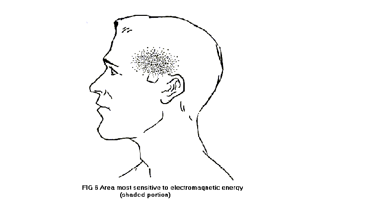 Becker (personal communication) has done some work indicating that there is longitudinal flow of charge carriers in neurons. Thus, it is reasonable to suspect that possibly the electromagnetic field could interact with neuron fields. As yet, evidence of this possibility is inconclusive. The strongest point against is that we have not found visual effects although we have searched for them. On the other hand, we have obtained other nonauditory effects and found that the sensitive area for detecting rf sounds is a region over the temporal lobe of the brain. One can shield, with a 2-in.sq. piece of fly screen, a portion of the strippled area shown in Fig. 6 and completely cut off the rf sound.