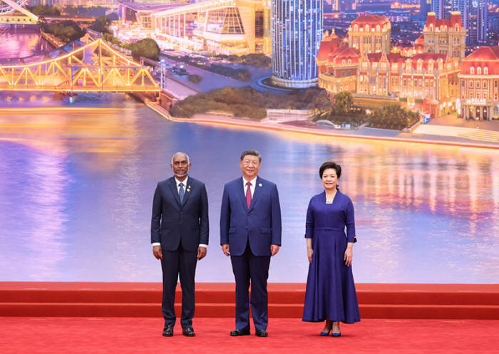 wife, Peng Liyuan, pose for a group photo with Maldivian