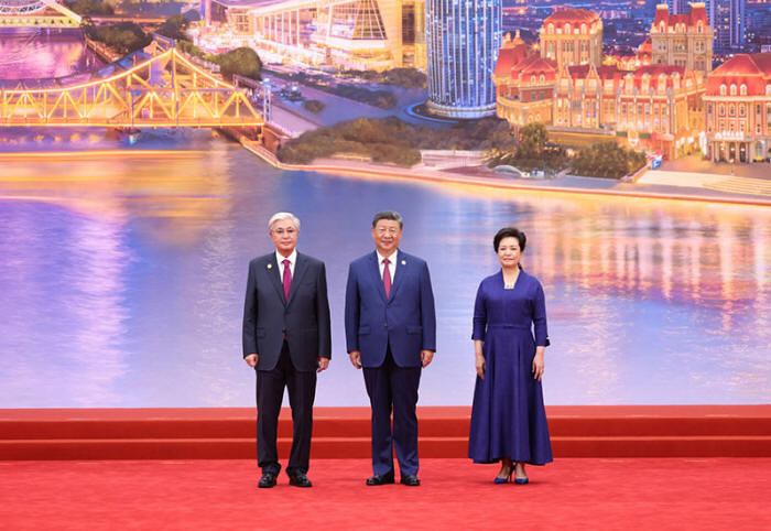 wife, Peng Liyuan, pose for a group photo with Kazakh
