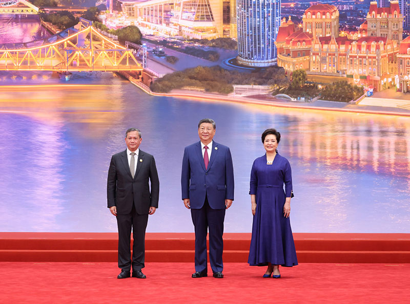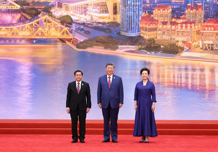 wife, Peng Liyuan, pose for a group photo with Cambodian