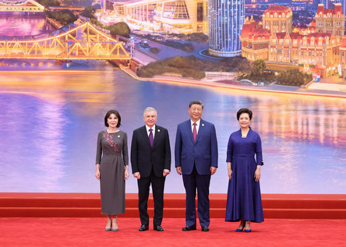 wife, Peng Liyuan, pose for a group photo with Uzbek