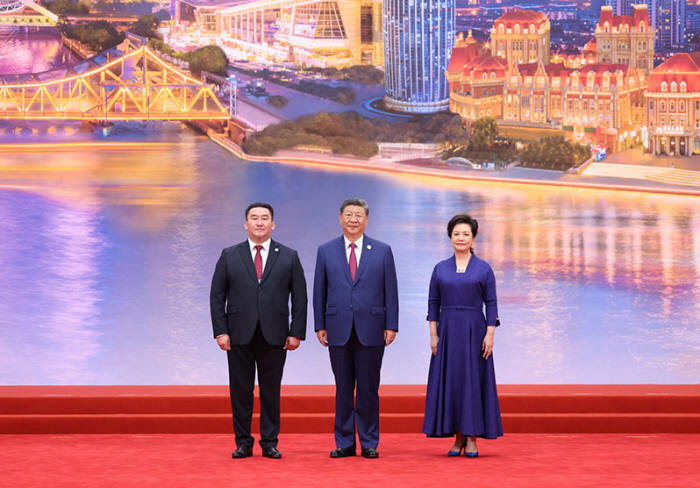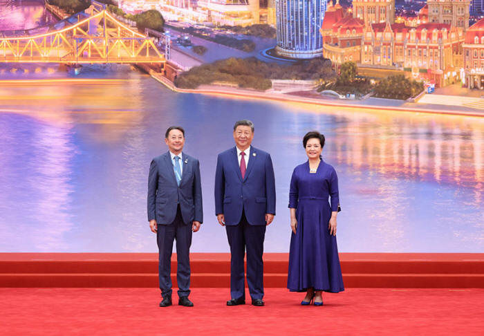 wife, Peng Liyuan, pose for a group photo with Mongolian