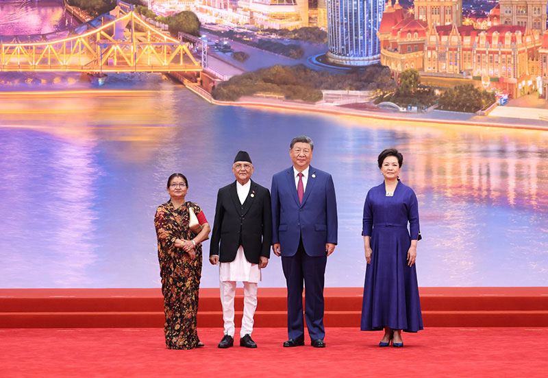 wife, Peng Liyuan, pose for a group photo with Nepali