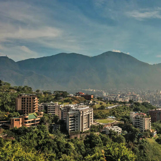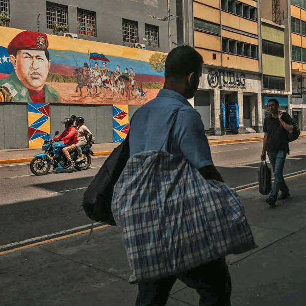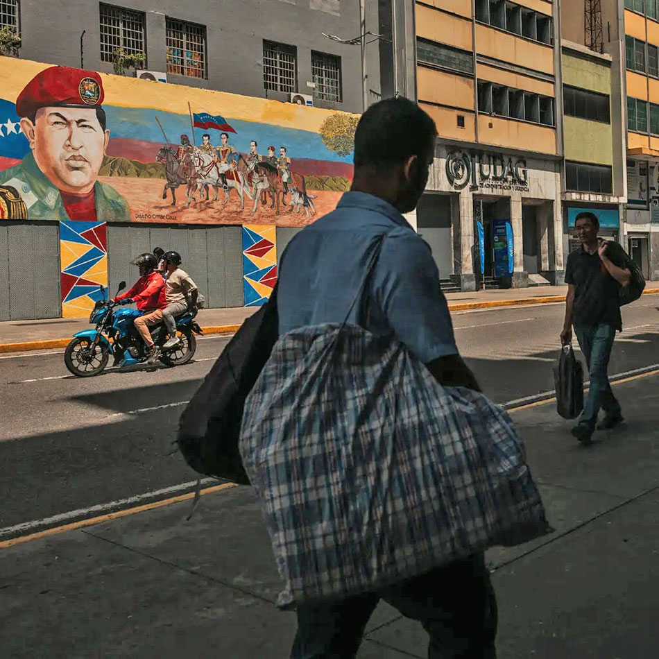 People walking under a painting of Hugo Chávez, the Venezuelan president