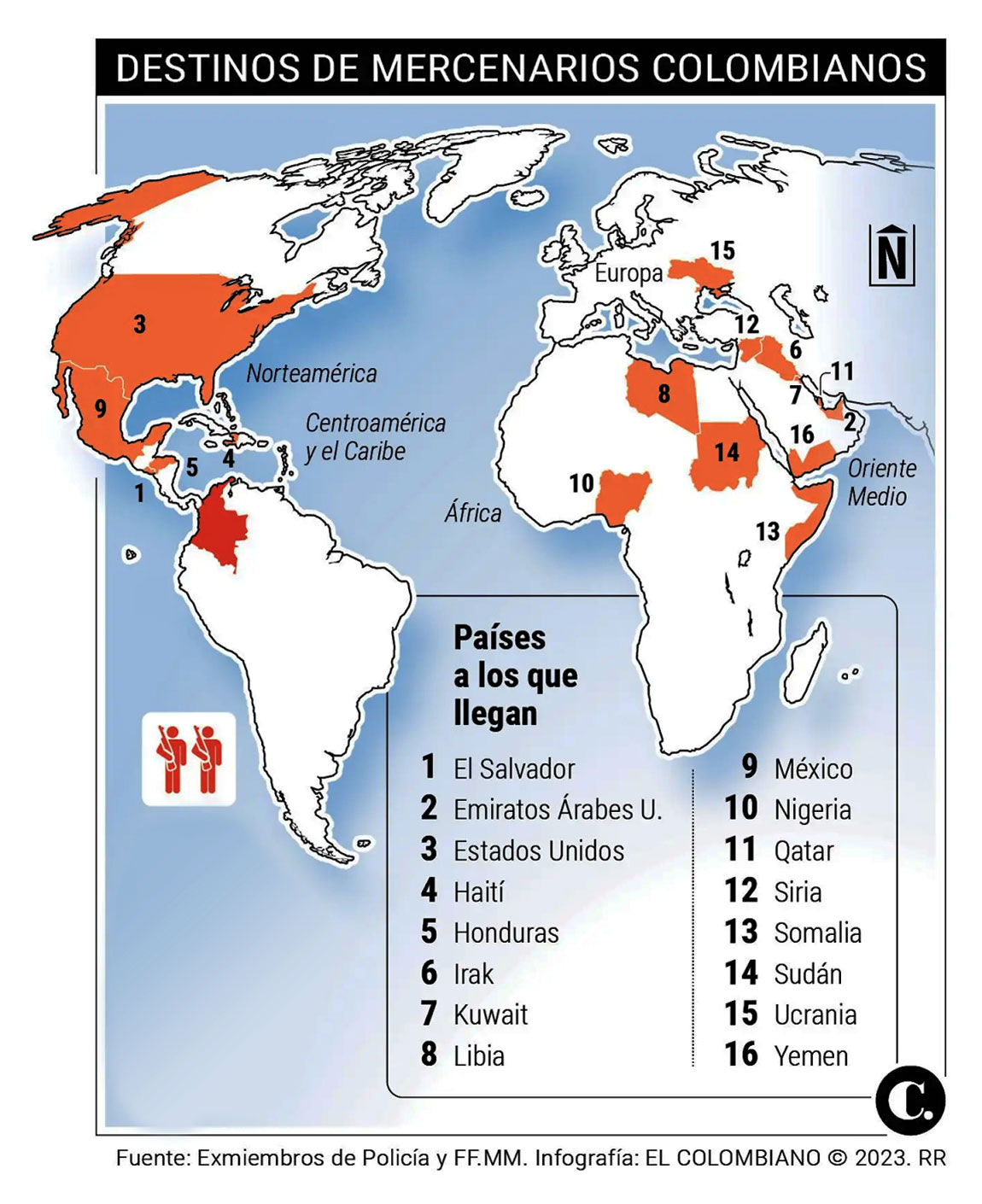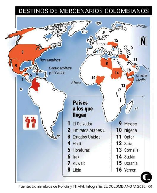 como mercenarismo. Mapa de Países con presencia de mercenarios colombianos.