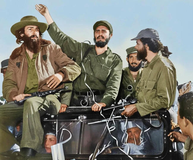 Fidel Castro, flanqueado por Camilo Cienfuegos (a la izquierda de la imagen) y Huber Matos, en el triunfo revolucionario. Cienfuegos moriría tempranamente, el 28 de octubre de 1959, a los 27 años, cuando regresaba de Camagüey tras sufrir un accidente aéreo. Había sido enviado a esa provincia con la orden de arrestar a Huber Matos, quien había denunciado la creciente "infiltración comunista" en el proceso revolucionario. Matos, finalmente, fue condenado a 20 años de prisión por traición y conspiración contra el Estado revolucionario, pena que cumplió íntegramente.