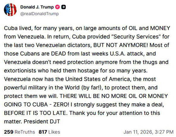 Sin embargo, tras el rapto de Maduro y el disciplinamiento de Delcy Rodríguez, el contexto habilita el retorno al acoso de Cuba.