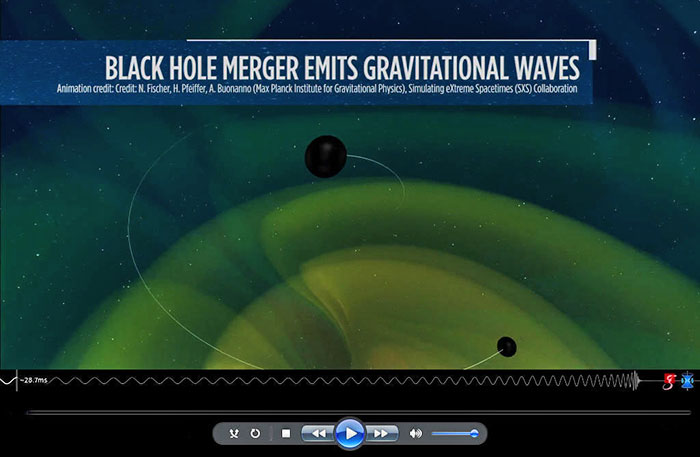 A simulation of the black hole merger event showing the chirp at the merger point which is followed by a ringdown. (Image credit: LIGO/Virgo)