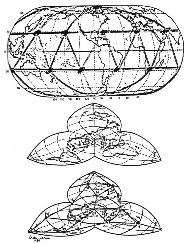 With the simple addition of 60 lines which connected the vertexes of Sanderson's icosahedron to the vertexes of the added Russian dodecahedron we had duplicated the Neolithic craftsman's model and established Fuller's 15 "great circle" polyhedron as a key link in the chain of grid ideas. Illustration #15 Our goal in producing EarthStar was the creation of a map that would be comfortable to an audience oriented to the equatorial linearity and continental positioning of a standard Mercator map. It depicts major river systems, seismic zones, major ocean currents and the lines of the UVG 120 Polyhedron. The map is an excellent tool for distance estimation, as the sides of the Basic Triangle measure 1400, 2200 and 2600 miles respectively. (An interesting numerological coincidence: the sides of the Basic Triangle add up to 6200 miles, or one-quarter of the circumference of the earth). We believe that this map was used by ancient navigators of the seas and skies, who would have found these great circle routes the most convenient and efficient for long-distance travel. Illustration #16 The UVG 4/30 Diamond centers on EarthStar will provide, we believe, the most fertile zones for research into the ancient history of the earth because they appear to be so geologically stable. In addition, there is a surprisingly full history of advanced cultures in these areas already established: the complex of Alexandria/Cairo/Jerusalem (point 1); a possible nuclear waste storage area postulated by Jalandris in Gabon (point 40): the People of the Four Corners (point 13); the sacred lands of the Hopi (point 17); the sacred lands of the Australian aborigines (point 44); the vast complex of megaliths and stone circles in the British Isles (point 11); the extraordinary Ugansk Bay Eskimo art complex (point 9); the ancient splendor of Amazonian cities now buried in vegetation (point 36); the Argentine Tafi megaliths (point 48); the contemporary site of major Soviet defense research (point 5). and the nearly unmatchable biological splendor of the Galapagos Islands (point 34).