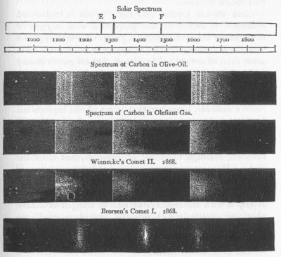 In Schellen's great work[1] I find a cut (see next page) comparing the spectra of carbon with the light emitted by two comets observed in 1868--Winnecke's comet and Brorsen's comet.