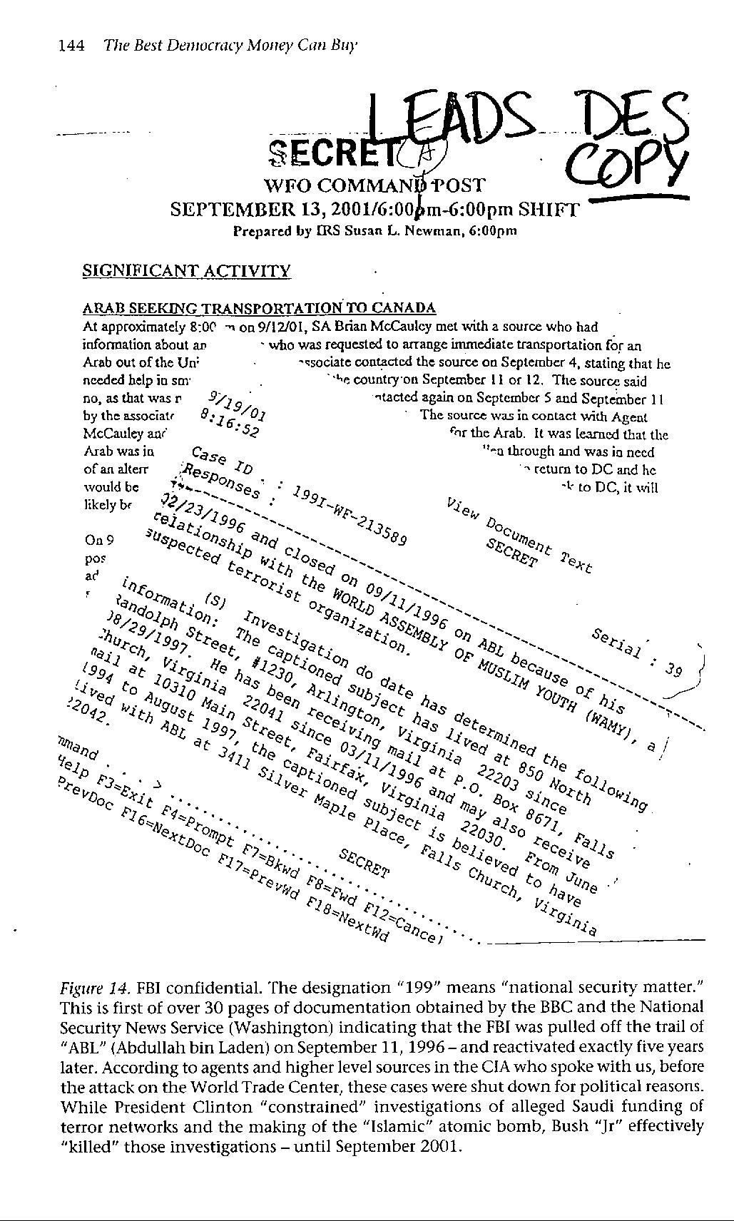 A secret FBI document, 199I WF213589, released from the Washington field office, was leaked by disgruntled FBI agents. It details how the FBI were ordered to discontinue investigation into members of the bin Laden family and WAMY (World Association of Muslim Youth) even though both networks had direct links to terrorism. Just weeks after the September 11 attacks, Pakistan and India expelled WAMY operatives with India stating that the Saudi-based WAMY was funding the militant Students Islamic Movement of India, which has provided support to Pakistani-backed terrorists linked to bombings in Kashmir.