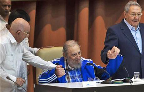 89-year-old Fidel Castro seated at the dais in Havana's Convention
