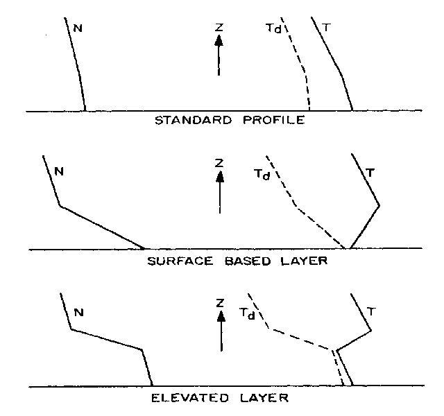Typical refractive index (N) profiles and sounding curves for three refractive index models. Solid curves on the right are for temperature -- dashed curves for dew point temperature.