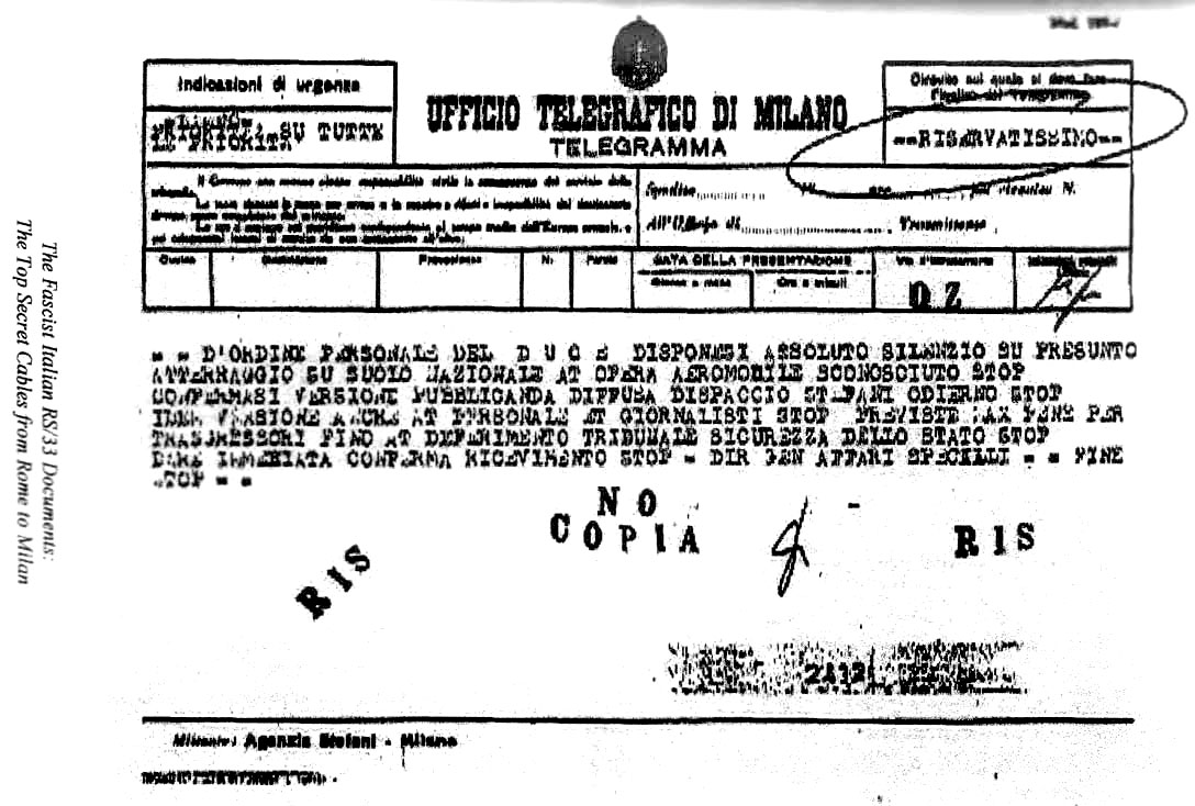 E. An Unlikely Source: Benito Mussolini's Secret RS/33 UFO- Marconi Study Group: The Original Italian "MJ-12" Documents But how could Dr. Wernher von Braun, Paperclip rocket "specialist", speaking in the early 1970s, be so exactingly prescient in his prediction of the exact sequence of "enemies"? One answer, that of the "Torbitt" document, is of course that he himself was a senior "insider", privy to the plots and canards of the innermost conspiracies driving western politics and culture. However, another source of material has emerged only recently that might afford a clue as to how long UFOs have been being secretly studied and attempts made to back engineer them for some time. In the year 2000, very secret papers from the archives of the Italian government were deliberately leaked to Italian UFOfologists. Unlike the MJ-12 documents, however, these documents were not films, nor photocopies, but the actual handwritten notes and original files and telegrams, on original paper, with original ink. This allowed documents experts from the University of Bologna to do an exhaustive analysis of the paper and inks and style of writing of the telegrams. The conclusion? The documents were undoubtedly authentic. The story they contained was nothing less than explosive, for they told how, in response to various UFO sightings in the north of Fascist Italy in 1933, and Italian Air Force scrambles to intercept the intruders, that Benito Mussolini had established the first state level black projects UFO study group, under the direction of the famous Italian physicist and inventor Marconi. The group, like a much later American project, assembles reports, photographs, witness testimonies, and developed a classification system for various types of sightings. The group was classified at the highest level by Mussolini. When Fascist Italy and Nazi Germany concluded the Rome-Berlin Axis, Mussolini transferred, often literally shipping this treasure trove of information to Nazi Germany, where it most likely made its way eventually into the hands of the SS. In any case, On February 23, 1941, as the war clouds between the Axis and the United States were growing darker, Mussolini made one of his characteristically blunt statements. He said,