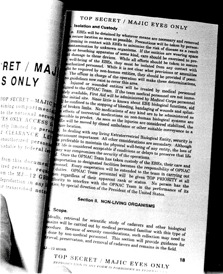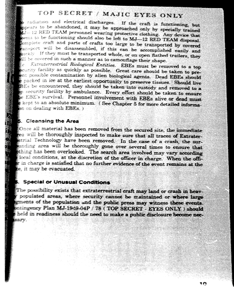 This 32-page manual shows the crafts as being disk-shaped, cigar-shaped, triangular or ice cream cone shaped. Entities are of two types — EBEs, both described in some detail. They’re not known to terrestrial science. It says that security is of massive importance. One of the principal objectives is to keep the public in the dark, a primary focus.