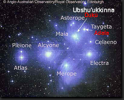The Hopi indians of Arizona call the celestial Ubšu'ukkinna Toonaotakha, which they translate as "the Confederation of Planets." It refers to a celestial region of 12 planets where dwell the Kachinas, the spiritual guides of the Hopi traditions (see Joseph Blumrich's transcription of White Bear's teachings, KASSKARA UND DIE SIEBEN WELTEN). The Toonaotakha stellar system is precisely situated in the Pleiades, named by the Hopis "Seven Sisters."Blumrich's work with White Bear is covered extensively by Anton Parks on Parks' page ATLANTIS CONTRE MU, found on Anton Parks.com. Kásskara is identified with the ancient Mu; Talawaitichqua with Atlantis. We have also indicated a planet named "Adala" (Sumerian ADA-LA, "the song of happiness") that according to Parks seems to exist in the Taygete system.
