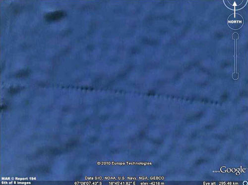 The above 1st image is included here not really to demonstrate anomalous submerged evidence in oceans as it is to demonstrate that what you will see in the evidence further down in this report is very likely influenced and compromised to some extent by official level obfuscation tactics in the Google Earth imaging.
