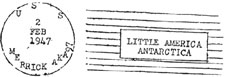 Figure 2 shows an error in the year date possibly caused by a failure to change the slug after December 31, 1946. These cancels are dated in early January 1947 and are not all that scarce. Merrick made use of the all purpose double-circle postmark but used it very sparingly. One example is known on the reverse of a cover (figure 3). An experimental mimeograph fancy cancel has been seen on both cards and covers with a 2 February 1947 date and LITTLE AMERICA / ANTARCTICA in the killer bars. The number of pieces bearing this fancy cancel are unknown to this writer but it must be a relatively small number (figure 4). Two different return address rubber stamps are known which provide additional documentation on Merrick mail. Of the two, figure 5 is the most common (figures 5, 6). Certainly the scarcest of all cachets found on Merrick mail would have to be the 'bear' cachet. According to one source these covers were prepared ahead of time for crewmembers but were not supposed to be used when it was discovered that the word 'Antarctic' was misspelled and that they pictured an inappropriate polar bear in the motif. Some, however, escaped destruction and were posted by some of the crew. Those seen by this writer are on Monarch size (#8) envelopes (figure 7). One additional variety of cover exists to lend more spice to the mail from this vessel and that is the use of envelopes printed on the USS MOUNT OLYMPUS with the wording MAILED AT / LITTLE AMERICA in the top center portion. Only one variety of these MALA blocks (see Mount Olympus section) has been found on Merrick mail. This being Type A (figure 8). The USS YANCEY, which was moored to the ice near the Merrick, did not have an official post office aboard (see Yancey section). As a result some of her mail was cancelled with a Merrick postmark. Figure 9 is a splendid example that can be