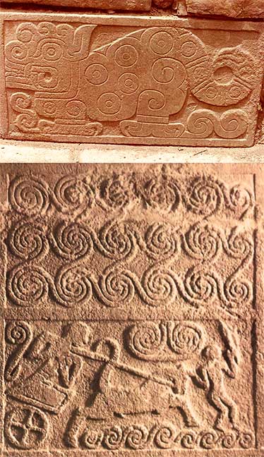 Illus. II– 2. (Top) Chavin's stele. (Bottom) Mycenae stele. Both with spirals and sigmoids.