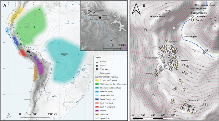 de los grupos e individuos analizados en este estudio. de los grupos de ascendencia genética descritos, la ubicación de los genomas de referencia publicados de los individuos modernos (círculos) y antiguos (triángulos) que constituyen estos grupos y de los sitios arqueológicos del que derivan los individuos de este estudio (ver también recuadro). (B) Mapa que muestra la ubicación de las cuevas funerarias en Machu Picchu destacándose las cuevas muestreadas en este estudio.