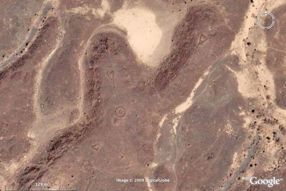 Some of the "wheels" found in Saudi Arabia have a bull's-eye design. Credit: Image courtesy Google Earth