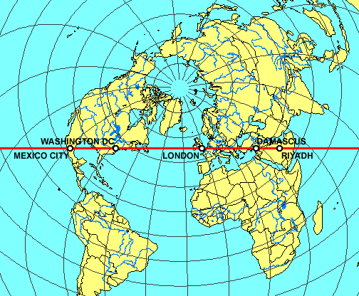 The image below is an equal azimuthal projection, also centered on New York City, with this same alignment extended in both directions.