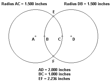 The radius of the circles below is 1.5 inches and the centers of the circles are 2 inches apart (AD). As a result, the distance between the two inner points of the circles at the middle height of the diagram is 1.000 inches (BC). The distance between the two points where the circles intersect is 2.236 inches (EF). 2.236 is the square root of 5.