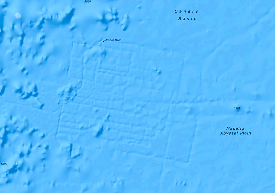 A pesar de que una gran cantidad de desinformación de Google, mapas batimétricos de la cuenca de Canarias no dejan lugar a duda de que una mega-ciudad con sede en el canal ha sido localizada cerca de 3,5 kilómetros por el fondo del océano, en el Monaco Deep (arriba).